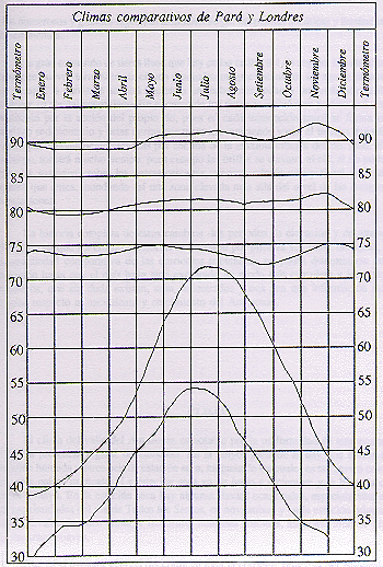 Las tres curvas superiores muestran las medias de las temperaturas más altas, medianas e inferiores en Pará durante cuatro años. Las dos curvas inferiores muestran las medias mensuales más alta y más baja de las temperaturas de Londres. LAMINA XI