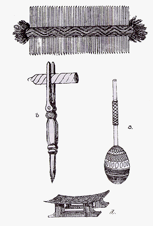 34. Peines de madera de palmera, adornados con plumas. (Lámina XIV, a.)