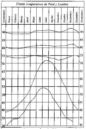 Las tres curvas superiores muestran las medias de las temperaturas más altas, medianas e inferiores en Pará durante cuatro años. Las dos curvas inferiores muestran las medias mensuales más alta y más baja de las temperaturas de Londres. LAMINA XI