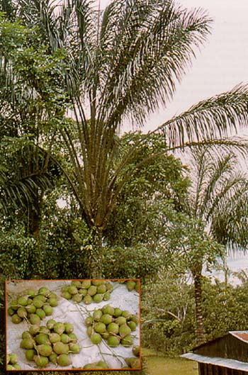 Descripción botánica: Palmera con estípite solitario de 10 a 15 m de altura y de 20 a 30 cm de di5metro, con espinas internodales desiguales y negras de 10 hasta 25 cm de largo dispuestas en anillos, entrenudos de 8 cm de longitud. Hojas pinnadas en número de 9 a 15, de 7 m de largo por 1,40 de ancho, presenta en su base una vigorosa vaina con numerosas espinas, peciolos profundamente acanalados. Frutos dispuestos en racimos de 1,5 m de largo, drupa globosa o elipsoide de color verde claro, de 5 a ó cm de largo, mesocarpo fibroso carnoso cubriendo a una nuez de 3 mm de espesor, endosperma pulpa blanca oleaginosa de 7 a 8 mm de espesor.