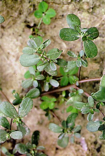 Descripción botánica: Planta herbácea anual, suculenta, postrada ascendente. Tallo cilíndrico, carnoso, glabro, verde o verdoso parduzco, lustroso. Hojas alternas o subopuestas, espatuladas, subsésiles de 2 cm de largo por 1,2 a 1,6 cm de ancho, atenuadas hasta la base, redondeadas en el ápice. Flores sésiles axilares, solitarias o en cimas paucifloras, sépalos 2 orbiculares de 4 mm de longitud; 5 pétalos amarillos de 6 a 8 mm de longitud, estambres de 7 a 12-1 ovario semiínfero, unilocular, multiovular. Fruto cápsula.