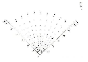 ÁREA PLANTADA: 2284 m2 en forma de cuarto de disco con radio de 53,93 m, 11x16 = 176 árboles plantados, con 16 espaciamientos entre 0,70 y 7,23 m.
