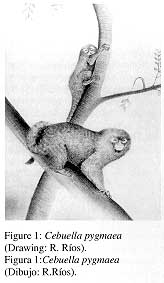 C. pygmaea, es el mono más pequeño del mundo. Alcanza una longitud total de 35 cm y un peso máximo de 150 gr. Debido a su pequeño tamaño muchas veces pasa desapercibido en su hábitat. Vive en los bosques aluviales de ribera y vegetación secundaria baja, densa y tupida, con abundancia de bejucos y enredaderas, generalmente a una distancia máxima de 50 m hacia el interior del bosque desde las orillas de los ríos, quebradas y lagunas. La elección de este tipo de hábitat probablemente está relacionada con la protección frente a los predadores y con la obtención de alimento, en especial insectos y exudados. Para su locomoción, alimentación y descanso hace uso de los estratos más bajos del bosque. Duerme en la base de las ramas horizontales de los arbustos con abundantes bejucos y lianas. Vive en grupos variables de hasta 10 individuos, formados por la pareja reproductora y sus descendientes, con edades fluctuantes desde adulto joven hasta infantes. No existe un período definido de pariciones, sin embargo, ocurren con mayor frecuencia a mediados y a finales del año. En cada parto nacen dos crías, siendo el padre él que mayormente carga y protege a los infantes. La dieta básicamente está constituida por exudados de cortezas de árboles y bejucos, entre los que destaca Vochysia lomatophylla (Vochysiaceae; quillosisa) y Cedrela sp. (Meliaceae; cedro). Para alimentarse perfora la corteza de los troncos en forma de buequecillos. También incluye en su dieta diversos insectos y frutos dulces. Mayor información sobre aspectos ecológicos y de dinámica poblacional se encuentra en CASTRO & SOINI (1977), RAMÍREZ et al. (1977), SNOWDON & HODUN (1981), SOINI (1982, 1987a, 1988, 1993), SOINI & SOINI (1990a) y SOINI et al. (1990).