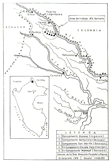 Los objetivos originales de la investigación incluían la obtención de información sobre ubicación de poblaciones, preferencias de hábitat, dieta, y sinecología en relación al huapo colorado. Además, se pretendía realizar una indagación de la factibilidad de un estudio sostenido en el medio natural. El plan original fue recorrer los principales afluentes de la margen oriental del Río Ucayali entre Requena y Pucallpa. Sin embargo, por falta de tiempo y facilidades logísticas, las actividades fueron restringidas al Río Tapiche y sus afluentes el Río Blanco y Quebrada Yanayacu (Fig. D, que cubren un área de aproximadamente el tamaño de Maryland.