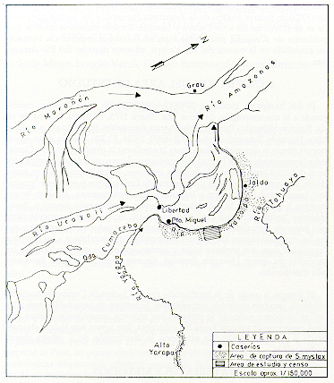 Estos resultados, las observaciones de Soini e informaciones de los lugareños conocedores de la fauna, indican que C. c. rubicundus tiene una amplia distribución en la cuenca del Tapiche, siendo particularmente abundantes en el Río Blanco. Un informante indicó que la margen occidental del Blanco por falta de especies maderables ha permanecido intocada, consecuentemente allí abunda el huapo colorado. Además, Cacajao está presente también en otras áreas de la margen oriental del Río Ucayali y Amazonas en Loreto. Por ejemplo, Soini (comunicación personal) vio un grupo en la Quebrada Blanco, afluente del Río Tahuayo (Fig. 1); otro investigador me informó la presencia de la especie a varias millas al interior de los bosques de Jenaro Herrera (R. Castro, com. per.). Por consiguiente, el km de distribución de Cacajao en el Perú abarca los bosques inundables al Este de los Ríos Ucayali y .Amazonas en Loreto.