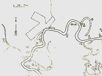 Fig. 1.- Mapa del área de estudio en "Los Angeles", Río Manití. El rectángulo delimita el área de censo de C. pygmaea. Los círculos numerados indican las ubicaciones de las manadas y otras unidades sociales de C. pygmaea presentes en el área de estudio en Diciembre 78 - Enero 79 (círculos con el número de referencia en paréntesis indican parejas incipientes y círculos con letra S inserta, solitarios). Las unidades sociales que fueron sometidas a saca total están señaladas con círculo sombreado, las de saca parcial con círculo semi-sombreado y las dejadas intactas con círculo blanco.