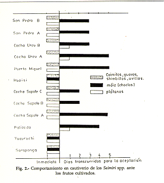 Fig. 2. - Comportamiento en cautiverio de los Saimiri spp. ante los frutos cultivados.