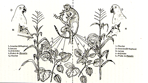 Se deduce que estos fenómenos están relacionados y son el resultado de continuas visitas a las "chacras" (con plantaciones de maíz) , donde la fauna entomológica es abundante y se hallan inducidos por visualización directa de alimentos consumidos y restos dejados por mamíferos y aves frugívoros (Cuadro 6 ). Estos últimos son consumidores naturales oportunistas, invasores de cultivos de maíz y plátano, que en sus incursiones diurnas y nocturnas dejan abiertas las mazorcas inmaduras de maíz o choclos y los plátanos, exponiéndolos al consumo por los monos frailes.