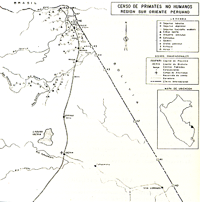 Desde el 29 junio al 16 Setiembre 1980, se llevó a cabo la evaluación primatológica en el Sur Oriente del Perú, teniendo como objetivo determinar la situación en que se encuentran las especies existentes en la región, principalmente la de Saguinus labiatus. La zona de evaluación comprendió el área entre los Ríos Acre y Tahuamanu, aunque también se hicieron observaciones entre Iberia y Puerto Maldonado. Se recorrió 655,24 km, de los cuales 245,74 km fueron considerados para cálculos de densidad poblacional. Se observaron 12 especies de primates y otras especies de la fauna silvestre. El Saguinus fuscicollis weddelli presentó una densidad relativamente alta, por S. labiatus y Cebus apella, entre otras; no obstante, las continuas vocalizaciones de C. brunneus y A. senuculus nos dan una idea de su alta densidad y distribución. Es común localizar asociaciones tanto de S. labiatus con S. f weddelli y Cebus apella con Saimiri boliviensis. Entre otras especies, se observó Ateles paniscus, Aotus sp., Pithecia irrorata y Cebuella pygmaea. las principales actividades de la región son la administración, agricultura, ganadería, comercio, extracción maderera y recolección de shiringa y castaña, estando limitada la caza.
