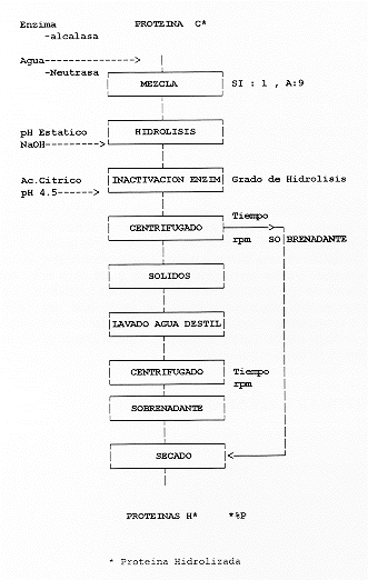 Usando proteasas comerciales (alcalasa y neutrasa) o vegetales (especificación referente a temperatura y pH optima, según fabricante), se conducira el estudio cinético para establecer los parámetros óptimos de hidrólisis del concentrado de proteína (temperatura, cantidad de enzima y sustrato, pH, grado de hidrólisis y pH de in activación), después del cual se procesa el hidrolizado, siguiendo el flujo de operaciones de la Figura 2.