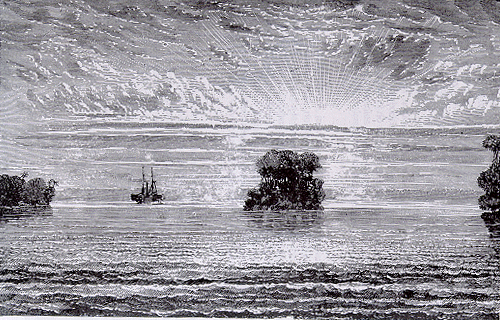 Gozábamos de un clima excelente, aunque todas las tardes, o por lo menos cuatro o cinco veces por semana, teníamos un "trovoádo", o tormenta, que se producía de repente, con rachas violentas de viento y a menudo con truenos y lluvia, pero pasaba en una o dos horas, dejando una atmósfera hermosamente suave y clara. Un gran lujo de este río es la ausencia de mosquitos. La puesta de sol, en lugar de ser la señal de las incomodidades y molestias, nos traía la parte más agradable del día. Podíamos sentarnos arriba del toldo, gozando de la fresca brisa vespertina, y sorber una taza de café, nuestro mayor lujo, hasta que el esplendor de la puesta del sol desaparecía rápidamente y las estrellas brillaban sobre nosotros. En esta hora tranquila, los chotacabras salían a cazar sus insectos sobre la corriente y nos divertían con sus rápidas evoluciones; las ranas arborícolas iniciaban sus quejumbrosos cantos, algunos papagayos retrasados cruzaban el río dirigiéndose a sus nidos, mientras los guarhibas llenaban el aire con sus voces ululantes. Cuando el rocío nocturno caía abundante sobre nosotros, me ponía bajo el toldo, mientras el Señor L., envolviéndose en una sábana, prefería. reposar en el exterior.