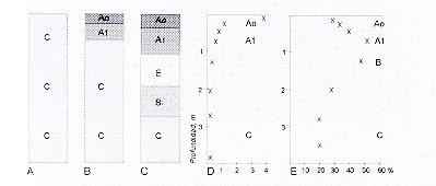 Figura 12.4. Ejemplos de la formación de suelos. A, B y C. Esquema del desarrollo de los horizontes de suelos en un material parental originalmente homogéneo. D. Material orgánico en las muestras de suelos diferentes profundidades en Tarapoto (Formación Pebas). E. El contenido de arcilla acción menos de 2 mm) en las mismas muestras de suelos. Símbolos: AO=capa orgánica; Al=mezcla de material orgánico y partículas minerales; E=zona de eluviación; B=zona de iluviación; C=material parental no alterado.