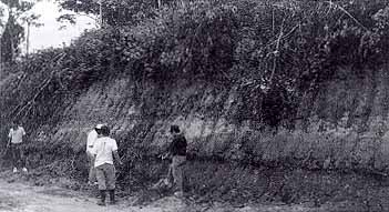 La estratigrafía y las estructuras de sedimentación original determinan mucho de las propiedades de los suelos en Iquitos. Estas características pueden ser observado en los perfiles verticales del suelo, por ejemplo en afloramientos en los márgenes de ríos, y como variación espacial en el tipo de los suelos superficiales entre lugares diferentes (Figura 12.1, ver también Figura 4.35 del Capítulo 4).