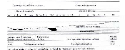 En el texto, la llanura de inundación del río Amazonas, se refiere a la zona caracterizada. por el complejo de orillales recientes, que sigue el cauce del río, tanto en sus tramos directos como en sus tramos anastomosados (con islas semipermanentes) y curvilíneos (o meándricos). Esta zona está sometida a procesos erosivos y sedimentarios de carácter continuo; existen variaciones pronunciadas en estos cambios, tanto a lo largo del mismo río como en años diferentes, según la cantidad y características de los sedimentos que arrastre (Tuukki el al. 1996). Contrariamente, la llanura de desborde (o cuenca inundable) casi no presenta rasgos recientes de migraciones fluviales; sin embargo presentan un drenaje pobre y están sometidas mayormente a procesos de sedimentación.