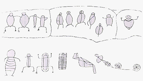 También son muy numerosas estas figuras en el río Uaupés, pero de éstas conservé mis dibujos. Son rústicas representaciones de utensilios domésticos, canoas, animales y figuras humanas, así como círculos, cuadrados y otras formas regulares. Todas están raspadas sobre la durísima roca granítica. Algunas se hallan por encima del máximo nivel de agua y otras por debajo, y muchas están totalmente recubiertas por líquenes, aunque pueden verse muy bien a través de éstos (Láminas XV y XVI). Es imposible saber por ahora si tenían alguna significación para los que las ejecutaron, o fueron simplemente los primeros intentos de un rústico arte guiado sólo por el capricho. Lo que está fuera de toda duda es que son de alguna antigüedad, y no han sido ejecutadas nunca por ninguna de las razas actuales de indios. Incluso entre las tribus más salvajes en donde se encuentran estas figuras, los indios no tienen ninguna idea sobre su origen; si se les pregunta dicen que no lo saben, o que suponen que las hicieron los espíritus. Muchos de los comerciantes portugueses y brasileños insisten en que son producciones naturales; o, para utilizar su propia expresión, que "Dios las hizo"; si se les pone alguna objeción, preguntan con aire de triunfo: "¿Es que Dios no pudo hacerlas?", con lo que se acaba la cuestión. En realidad, la mayoría de ellos son incapaces de ver ninguna diferencia entre estas figuras y las marcas y venas naturales que se producen frecuentemente en las rocas.