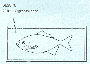 La ovulación y desove se realiza a las 11 ± 2 horas ó 290 a 320 hora grados. WOYNAROVICH (1 981), recomienda la práctica de sutura de la papila urogenital para lograr mayor eficiencia en la colección de óvulos; sin embargo, esta práctica no es generalizada y algunos operadores prefieren prescindir de ella, manteniendo vigilada a la hembra en los instantes próximos al desove. (Fig. 6.5).