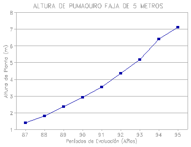 En el sistema de faja de 5 m de ancho, el Pumaquiro presenta un lento crecimiento; ésto se debe a la poca cantidad de luz que ingresa en la faja, observándose un crecimiento no uniforme; existiendo variabilidad en cuanto a su comportamiento, tal es así que la variación aumenta a medida que transcurren los años.