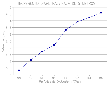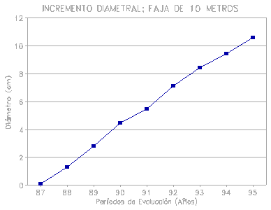 En el sistema de faja de 10 m de ancho presenta un incremento promedio de 1,31 cm/año, notándose un desarrollo diametral moderado; esta especie presenta una variabilidad de 36 %, que expresado en términos silviculturales no representa competencia entre los árboles por el momento.