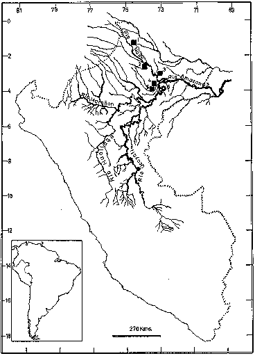 The study areas were located 1) along the middle course of the Napo River between Santa Maria, Santa Clotilde, and Puerto Huamán; 2) along the lower course of the Nanay River between Lagunas, Yarina, and Mishana; and 3) in the vicinity of Huaisi along the lower course of the Tahuayo River (Fig. 1). Observations were made from canoes and were concentrated along the river and the oxbow lake or "cocha" margins and in the proximity of small feeder streams.