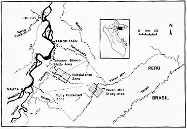 Two study areas were researched between June 1990 and August 1992 in the Reserva Comunal Tamshiyacu-Tahuayo situated in northeastern Peru between the Tamshiyacu, Tahuayo and Yavari Miri rivers (Fig. 1). The reserve covers an area of 322 500 ha of continuous forest and is predominantly (> 75%) non-flooded terra firma habitat (Bodmer et al., 1990b). One study area was located in the Tahuayo-Blanco region of the reserve which experiences persistent hunting pressure and the other in the Yavari Miri region which experiences slight (occasional) hunting pressure.