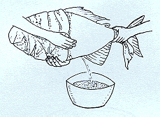 Al cumplirse las hora-grados para el desove, se retira la sutura o se captura con cuidado a la hembra, cubriendo de inmediato con una mano la abertura urogenital para evitar la pérdida de óvulos. En esta operación, se seca a la hembra con una toalla suave para eliminar el agua, se presiona ligeramente los costados del cuerpo para la obtención de los óvulos que se reciben en una bandeja pequeña. En ese instante debe tenerse cuidado de no deslizar las manos para no ocasionar la pérdida de escamas (Fig. 6.6).
